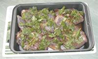 Sprinkle chili powder over pheasant pieces. Spread cilantro sprigs over pheasant in 9 x 13 pan. Roast, covered tightly with foil, at 450° F for 30 minutes.